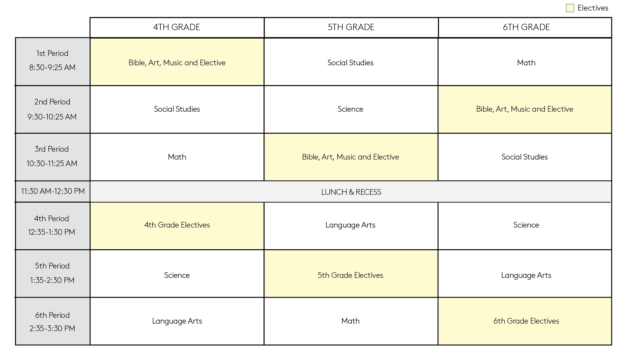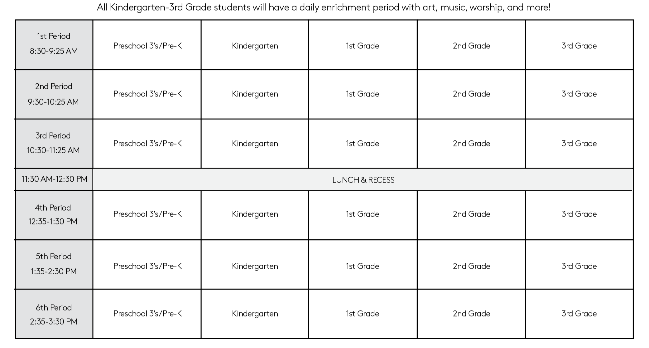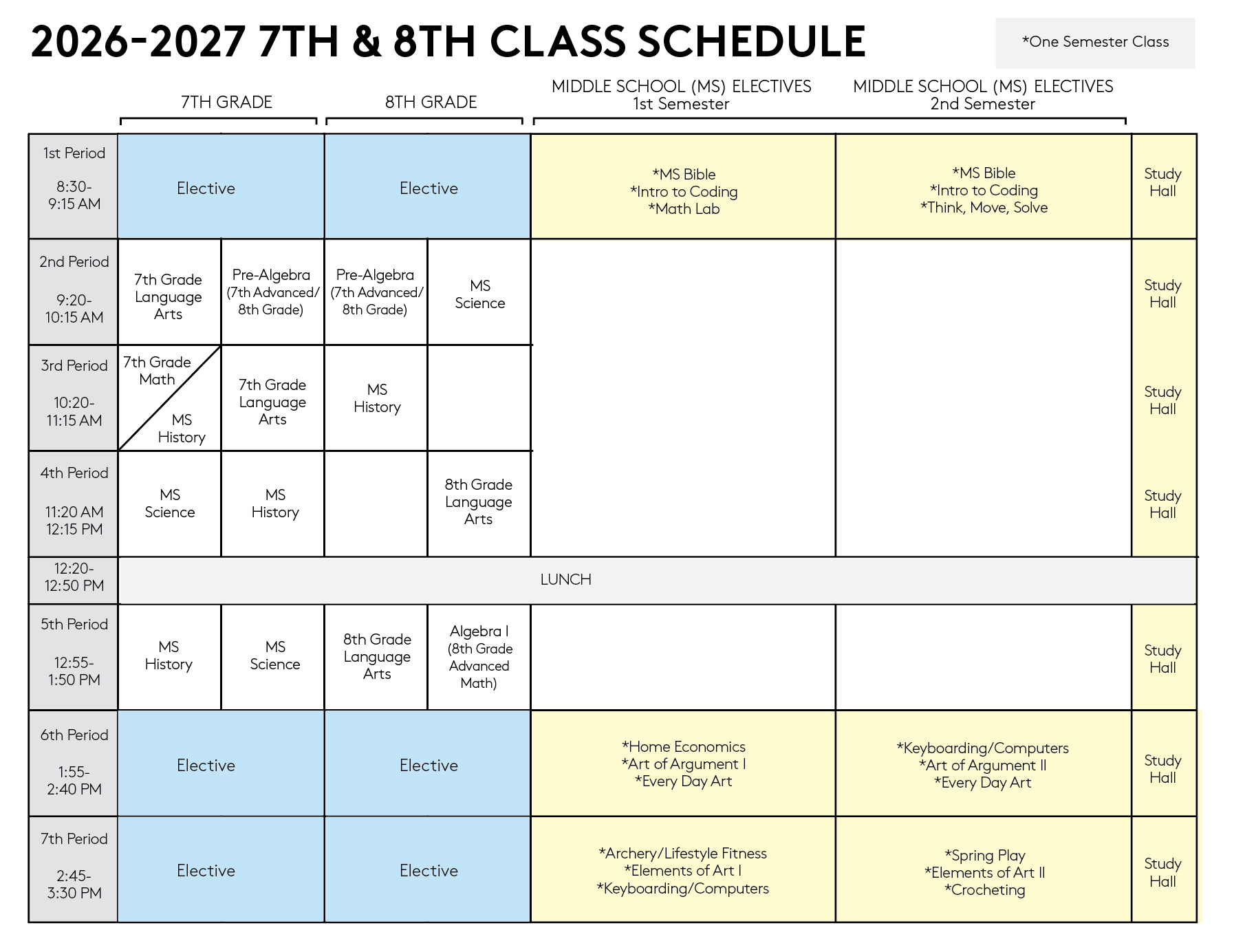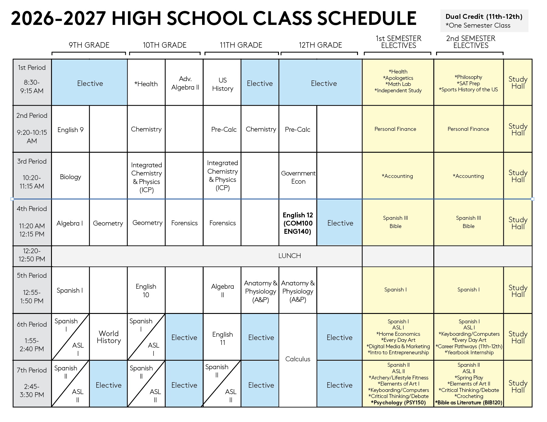 Class Schedules 2026-2027 PRESCHOOL 3’S-3RD GRADE SCHEDULE 2026-2027 4TH-6TH CLASS SCHEDULE Middle School Class Descriptions High School Class Descriptions Academic Calendars